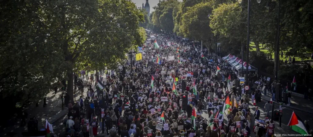 Cientos de miles de personas se congregaron este sábado (11.10.2025) en una marcha a favor de los palestinos en Londres con motivo del segundo aniversario del inicio de la guerra en Gaza y un día después de la entrada en vigor del acuerdo de alto el fuego entre Israel y Hamás.