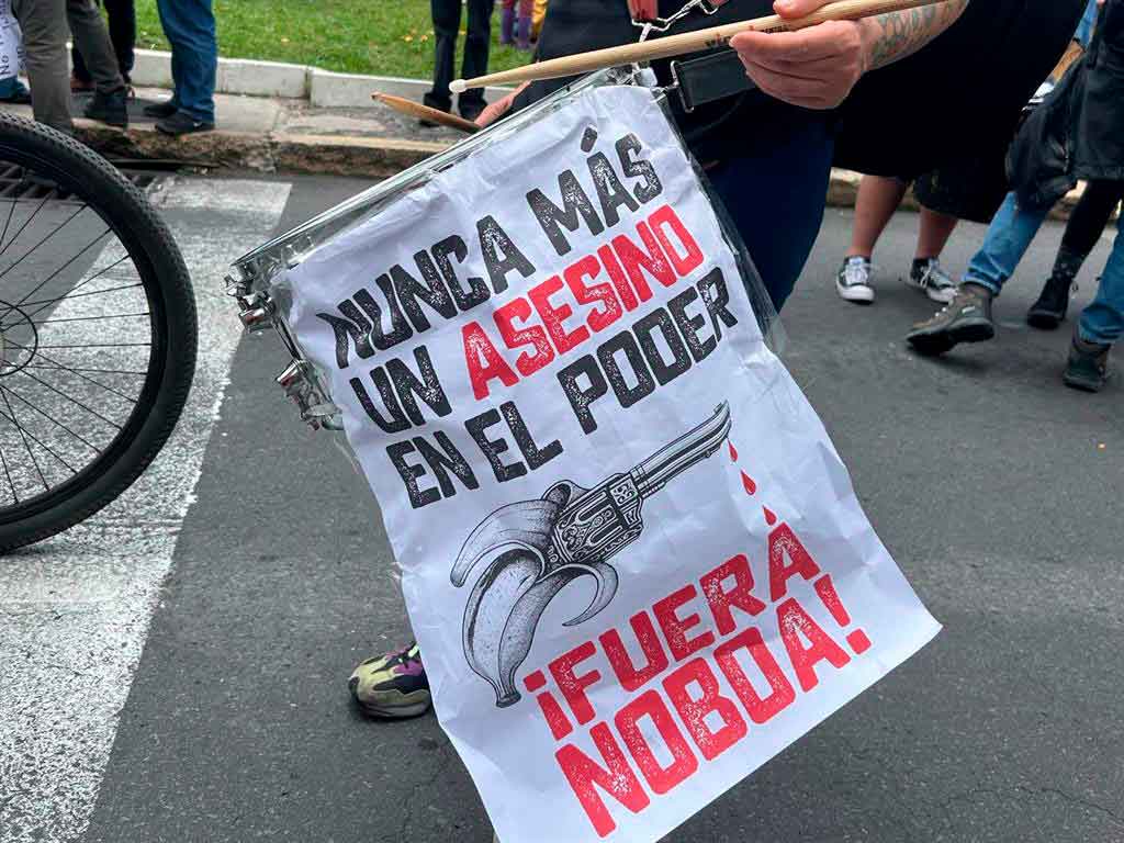 Con carteles y consignas de “Fuera Noboa, fuera”, en la marcha participaron artistas, estudiantes, miembros del Frente Unitario de Trabajadores (FUT), de la Unión Nacional de Educadores (UNE) y de la Confederación Ecuatoriana de Organizaciones Clasistas Unitaria de Trabajadores (Cedocut).