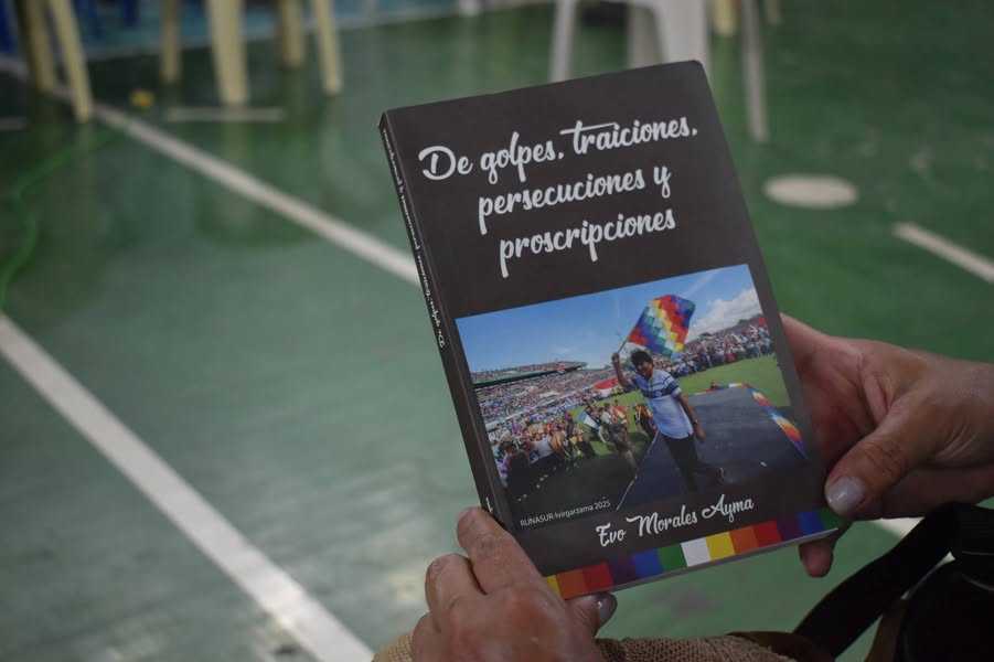 El libro lleva el título “De golpes, traiciones, persecuciones y proscripciones”, tiene 12 capítulos y 174 páginas y fue presentado durante el encuentro de Runasur y el Movimiento Intercontinental Anticolonial (MIA) celebrado en Villa Tunari.